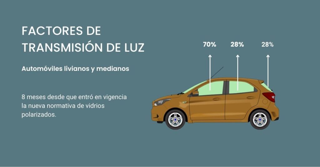La normativa, que rige desde el 11 de marzo del 2022 y empezó a regir en su totalidad luego de una marcha blanca de cuatro meses, establece como límite máximo de transmisión luminosa del 70% para los vidrios laterales delanteros y del 28% para los vidrios traseros de los vehículos en circulación en el territorio chileno.